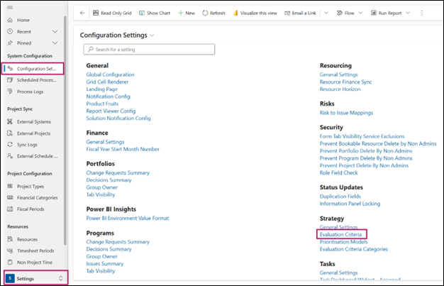 Navigate to the Evaluation Criteria link in the Strategy grouping in Configuration Settings: