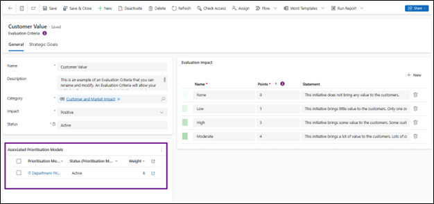 - Associated Prioritisation Models: Once you start associating an Evaluation Criteria with a Prioritisation Model, you will see the list of associated prioritisation models on the Evaluation Criteria form.