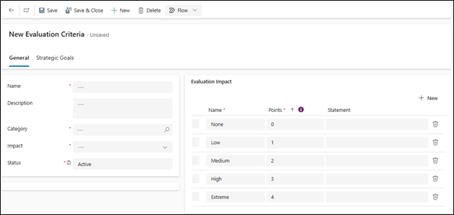 - Click the New button within the menu bar. This will open the New Evaluation Criteria form.