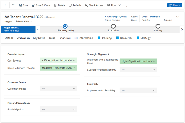 Active Evaluation Criteria and their Categories display within the Initiative's Evaluation tab.