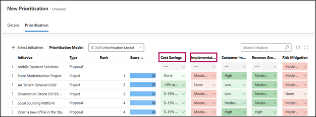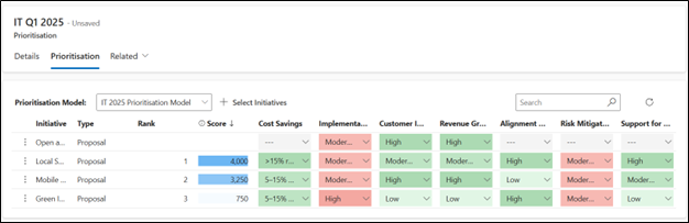 The values selected are then used to calculate an Initiatives Rank and Score, within a Prioritisation model.