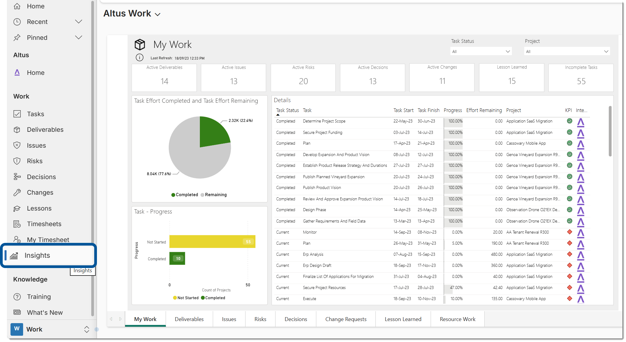 As you can see, the Work Insights report pulls all the individual team member project data together in such a way that helps focus your attention on those items needing attention, helps you to plan, and shows you all the work you have completed.