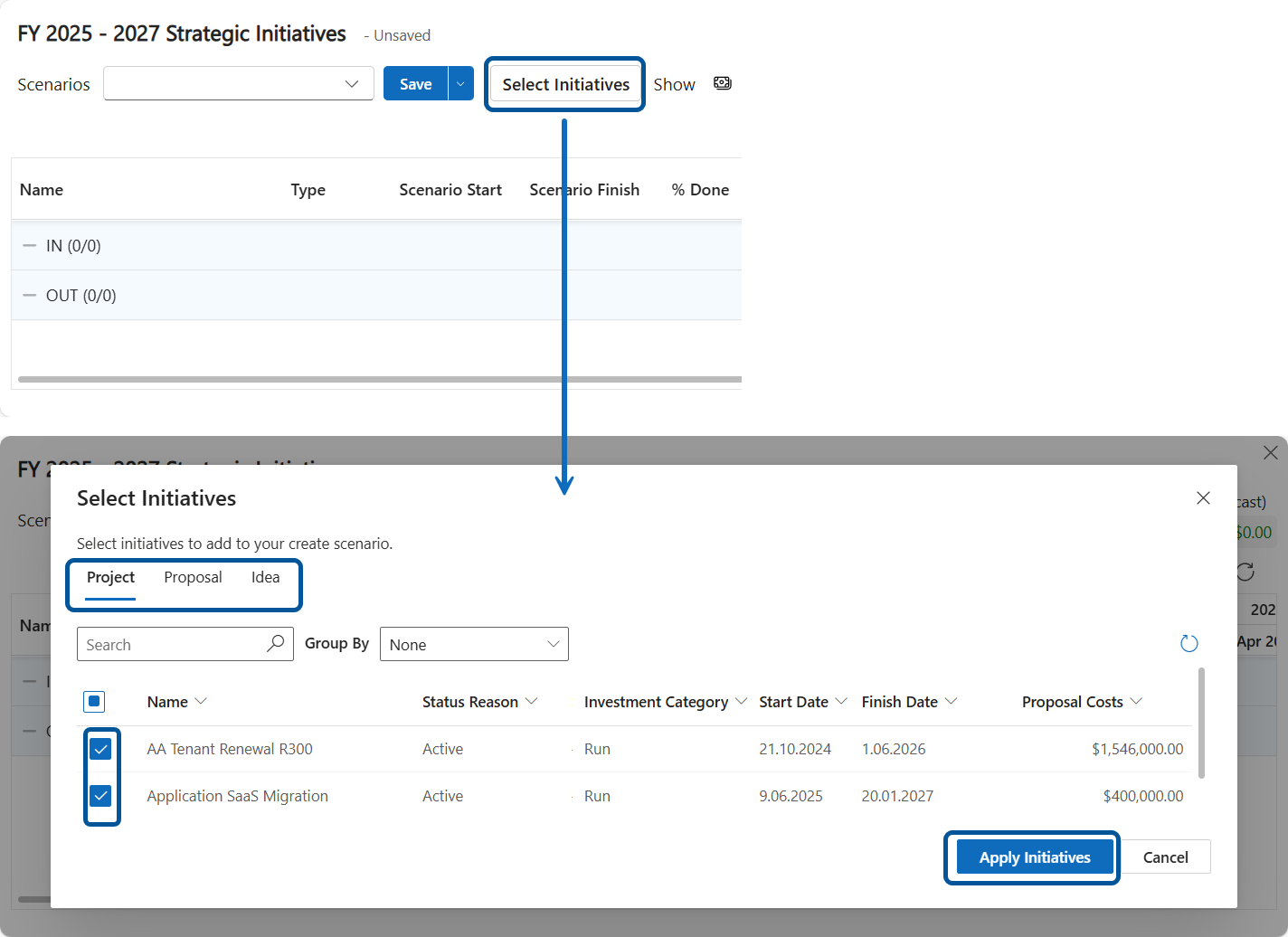 - Select Initiatives. In the scenario pop-up window, click Select Initiatives and choose the projects, proposals, and/or submitted ideas you want to include in the scenario, based on your defined date range and budget.