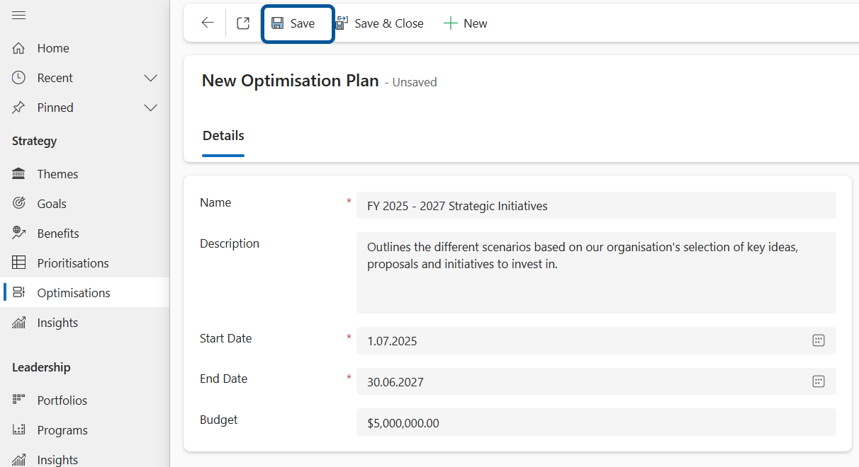 - Specify the start and finish dates—this defines the timeframe for strategic initiatives.