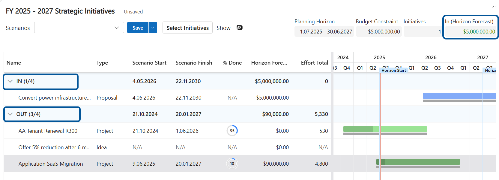4. Adjust the Scenario ("What-If" Planning). Drag and drop initiatives to the Out list to reduce the total forecast cost aiming to bring the forecast within or under the set budget constraint.