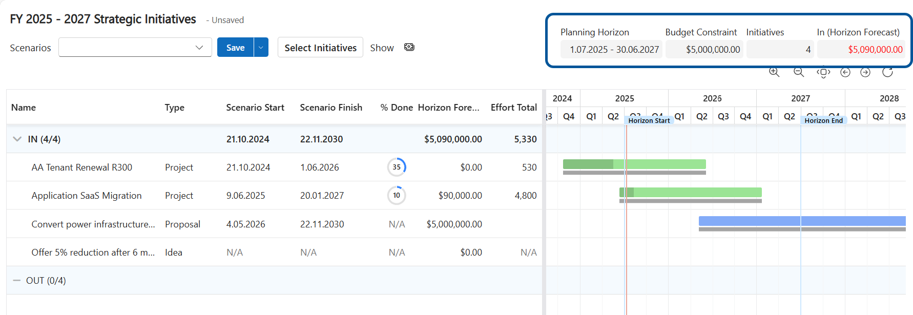 - Review Budget Constraints vs Forecast Cost: Once initiatives are added, review the total forecast cost of the initiatives within the set horizon against your budget constraints. Use this comparison to decide which initiatives to keep or move out of the scenario.