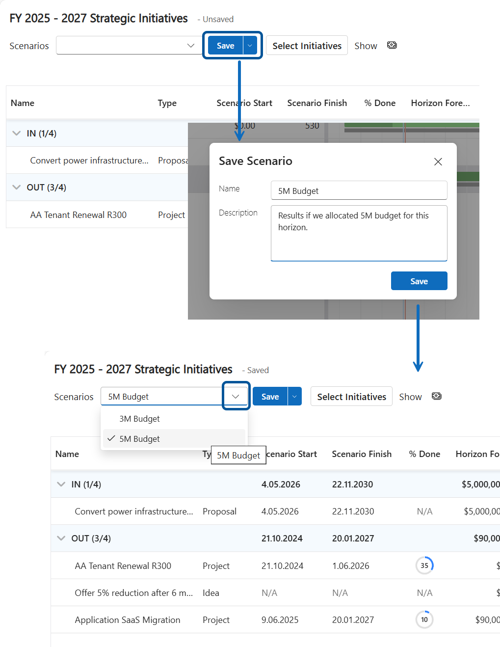 Note: Observe real-time updates to the forecast total as you move initiatives in or out and continue adjusting until the scenario meets your desired budget and planning conditions. The budget constraint value cannot be changed once the scenario is saved. To use a different budget, you must create a new scenario.